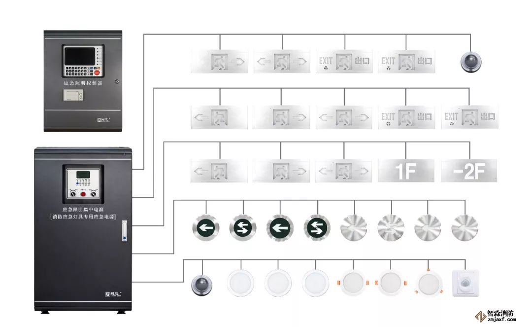 消防應急照明和疏散指示系統(以下稱疏散系統)產品按GB 17945-2010《消防應急照明和疏散指示系統》國家標準設計生產,并符合GB 51309-2018《消防應急照明和疏散指示系統技術規范》要求。屬于集中電源集中控制型系統,涵蓋應急照明控制器,應急照明集中電源、應急照明標志燈具、應急照明燈具等類型的產品,燈具供電采用36V安全電壓的功率二總線供電及通訊,施工布線簡單,調試方便。
