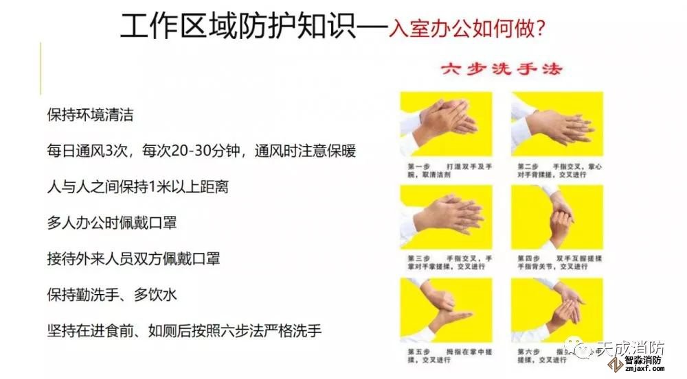 保持辦公區環境清潔,建議每日通風3次,每次20-30分鐘,通風時注意保暖。人與人之間保持1米以上距離,多人辦公時佩戴口罩。保持勤洗手、多飲水,堅持在進食前、如廁后按照六步法嚴格洗手。接待外來人員雙方佩戴口罩。