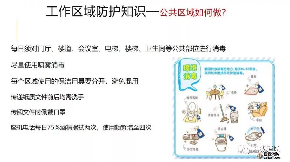 每日須對門廳、樓道、會議室、電梯、樓梯、衛生間等公共部位進行消毒,盡量使用噴霧消毒。每個區域使用的保潔用具要分開,避免混用。