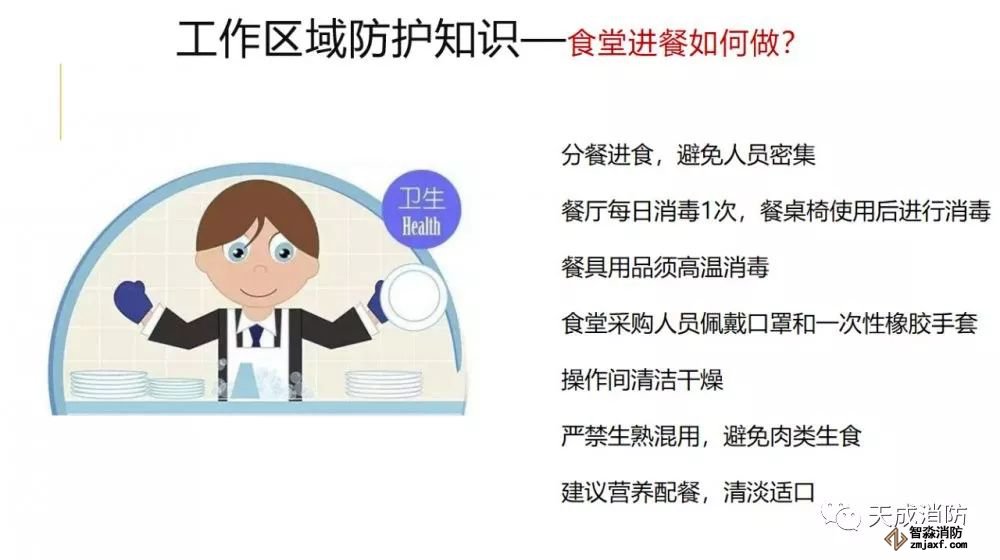 采用分餐進食,避免人員密集。餐廳每日消毒1次,餐桌椅使用后進行消毒。餐具用品須高溫消毒。操作間保持清潔干燥,嚴禁生食和熟食用品混用,避免肉類生食。建議營養配餐,清淡適口。