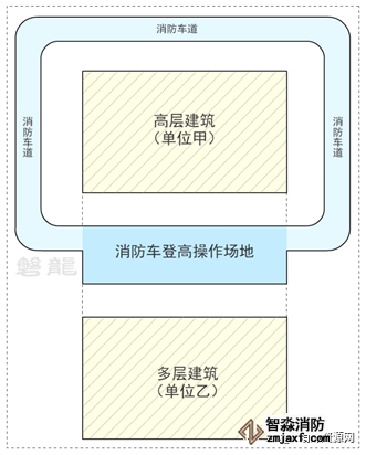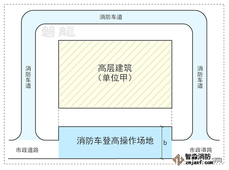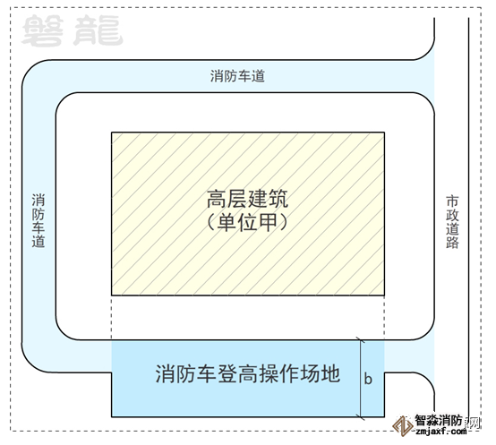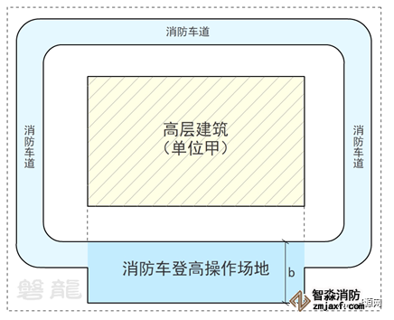 1、圖示1中,自有消防車道可以作為消防車登高操作場地的一部分,保證b的不小于10m即可。