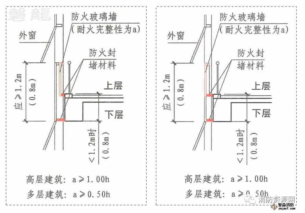 由上可知,窗檻墻部位可以采用防火玻璃墻或固定式防火窗,不應采用可開啟的防火窗(活動式防火窗)。