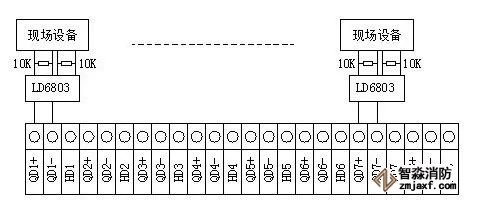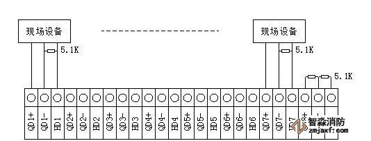 當被控設備和聯動控制盤距離較近時推薦使用多線制輸出方式,多線制連接示意圖