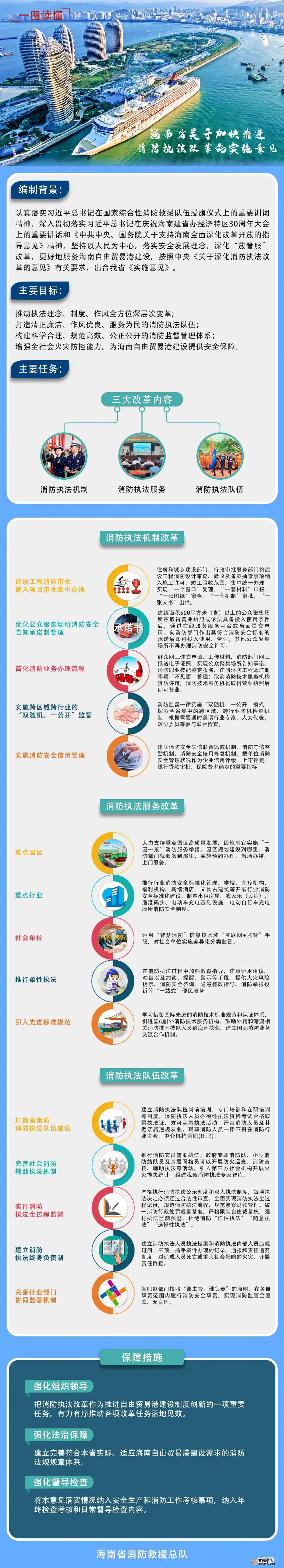 據(jù)介紹,為認(rèn)真貫徹落實(shí)中共中央辦公廳、國(guó)務(wù)院辦公廳印發(fā)的《關(guān)于深化消防執(zhí)法改革的意見(jiàn)》要求,海南省委、省政府于近日正式出臺(tái)了《關(guān)于加快推進(jìn)消防執(zhí)法改革的實(shí)施意見(jiàn)》(以下簡(jiǎn)稱《實(shí)施意見(jiàn)》)。《實(shí)施意見(jiàn)》從執(zhí)法機(jī)制、消防服務(wù)、執(zhí)法隊(duì)伍3個(gè)方面明確了15項(xiàng)具體改革措施。