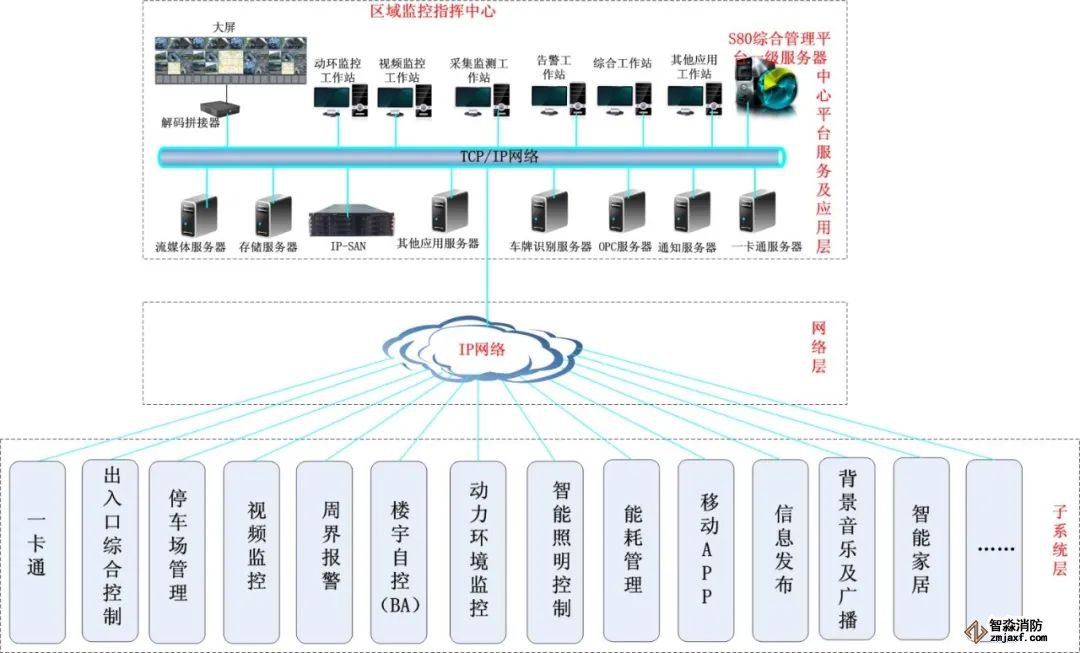 整個園區面積非常大,區域建設較多且分散,加之智能化建設涉及較多的系統,為保證建設方統一的管理和各系統之間的互聯互動,因此,需要建立一套智能化集成管控平臺,以及在園區總控中心和分控中心組建多級服務器架構,集中監控各區域的智能化系統,通過智能管理平臺的建設,實現物業中心統一監控,各區域獨立監控的管理模式。