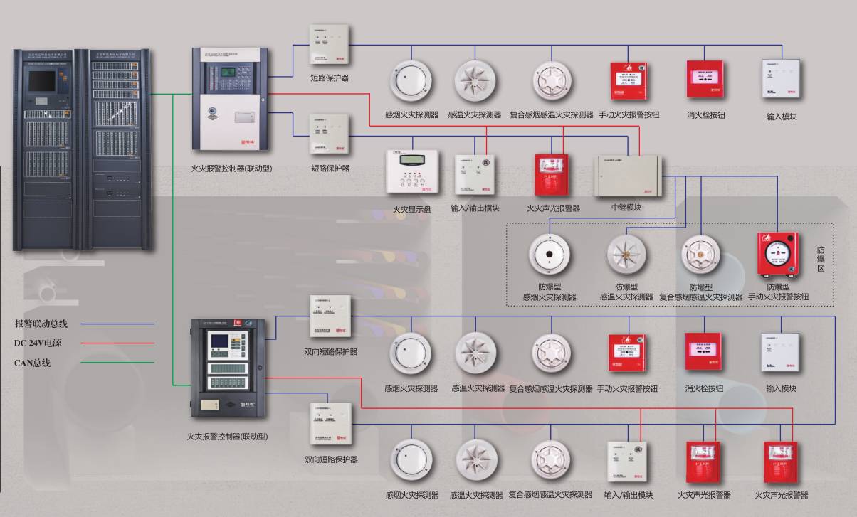 火災(zāi)自動報警系統(tǒng)是探測火災(zāi)早期特征、發(fā)出火災(zāi)報警信號,為人員疏散、防止火災(zāi)蔓延和啟動自動滅火設(shè)備提供控制與指示的消防系統(tǒng)。火災(zāi)自動報警系統(tǒng)由集中報警控制器、消防控制室圖形顯示裝置、聯(lián)動控制盤、區(qū)域火災(zāi)報警控制器、氣體滅火控制器、感煙火災(zāi)探測器、纜式線型感溫火災(zāi)探測器(感溫電纜)、手動火災(zāi)報警按鈕、火災(zāi)聲光報警器、輸入模塊、輸出模塊等組成。實現(xiàn)本報警區(qū)域內(nèi)的火災(zāi)檢測及相關(guān)設(shè)備的聯(lián)動控制。