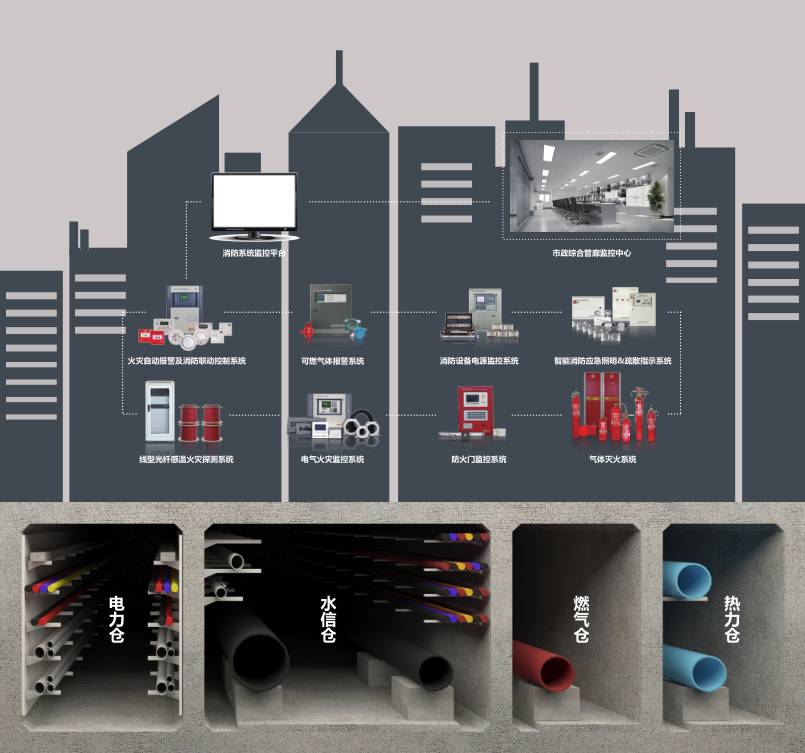 綜合管廊內每個報警分區設置1套區域火災自動報警控制系統,每個艙每隔50米設置1套手動報警按鈕、警鈴;每層電力電纜上S型設置纜式線型感溫火災探測器(感溫電纜)或線型光纖感溫火災探測器;在每個艙頂部設置點型感煙火災探測器(或線型光纖感溫火災探測器);配電室設置點型感煙火災探測器、點型感溫火災探測器及消防電話分機。火災報警控制器通過報警總線連接本區段內的感煙火災探測器、纜式線型感溫火災探測器、手動火災報警按鈕(帶電話插孔)、火災聲光警報器、輸入模塊、輸出模塊,實現本報警區域內的火災監測及相關設備的聯動控制。