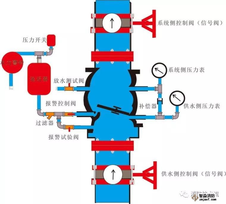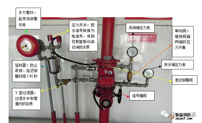 濕式報(bào)警閥體、系統(tǒng)側(cè)壓力表、供水側(cè)壓力表、補(bǔ)償器、放水測試閥(常閉)、報(bào)警控制閥(常開)、報(bào)警試驗(yàn)閥(常閉)、過濾器、延遲器、壓力開關(guān)、水力警鈴。