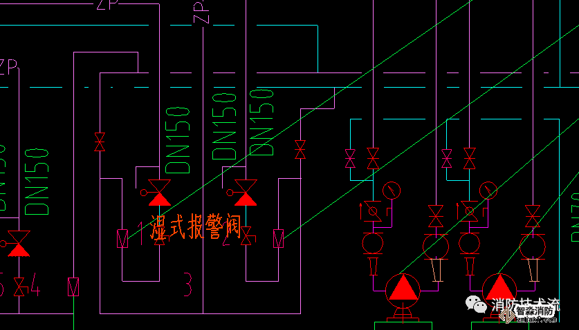 3)水源控制閥、報(bào)警閥與配水干管的連接,應(yīng)使水流方向一致。