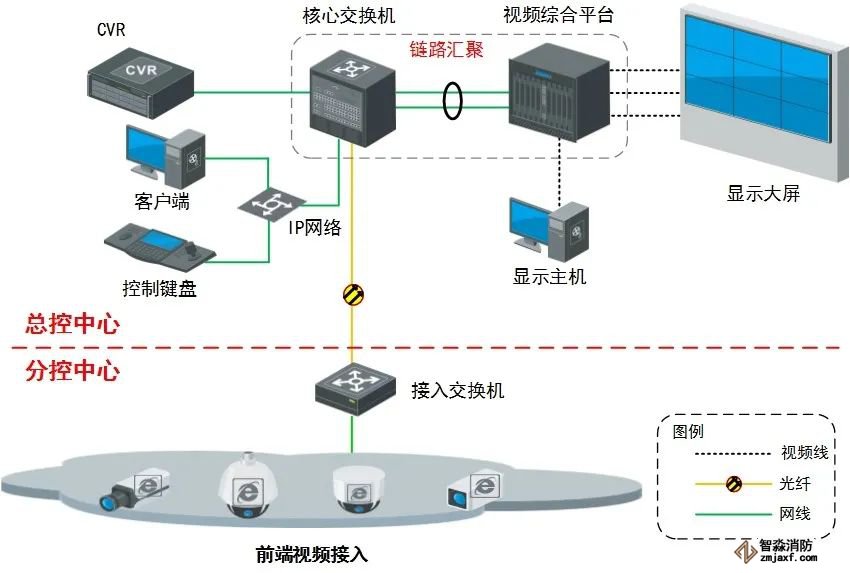 分控中心:負責(zé)對前端分散區(qū)域高清監(jiān)控點的接入、存儲、瀏覽、設(shè)置等功能;主要部署接入交換機、客戶端等。