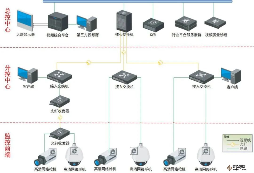 總控中心:負責(zé)對分控中心分散區(qū)域高清監(jiān)控點的接入、顯示、存儲、設(shè)置等;主要部署核心交換機、視頻綜合平臺、大屏、云存儲、客戶端、平臺、視頻質(zhì)量診斷服務(wù)器等。