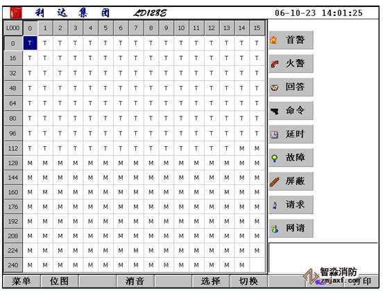 按“位圖”鍵,進(jìn)入總回路列表,點擊相應(yīng)回路進(jìn)入下圖。其中“T”表示探測類設(shè)備,“M”表示控制類模塊;紅色表示有火警發(fā)生,黃色表示故障,青色表示請求,指火警發(fā)生時要求啟動的相應(yīng)部位的設(shè)備(只適用于“全局手動”時,“全局自動”狀態(tài)時無請求,設(shè)備直接啟動,顯示在命令行)